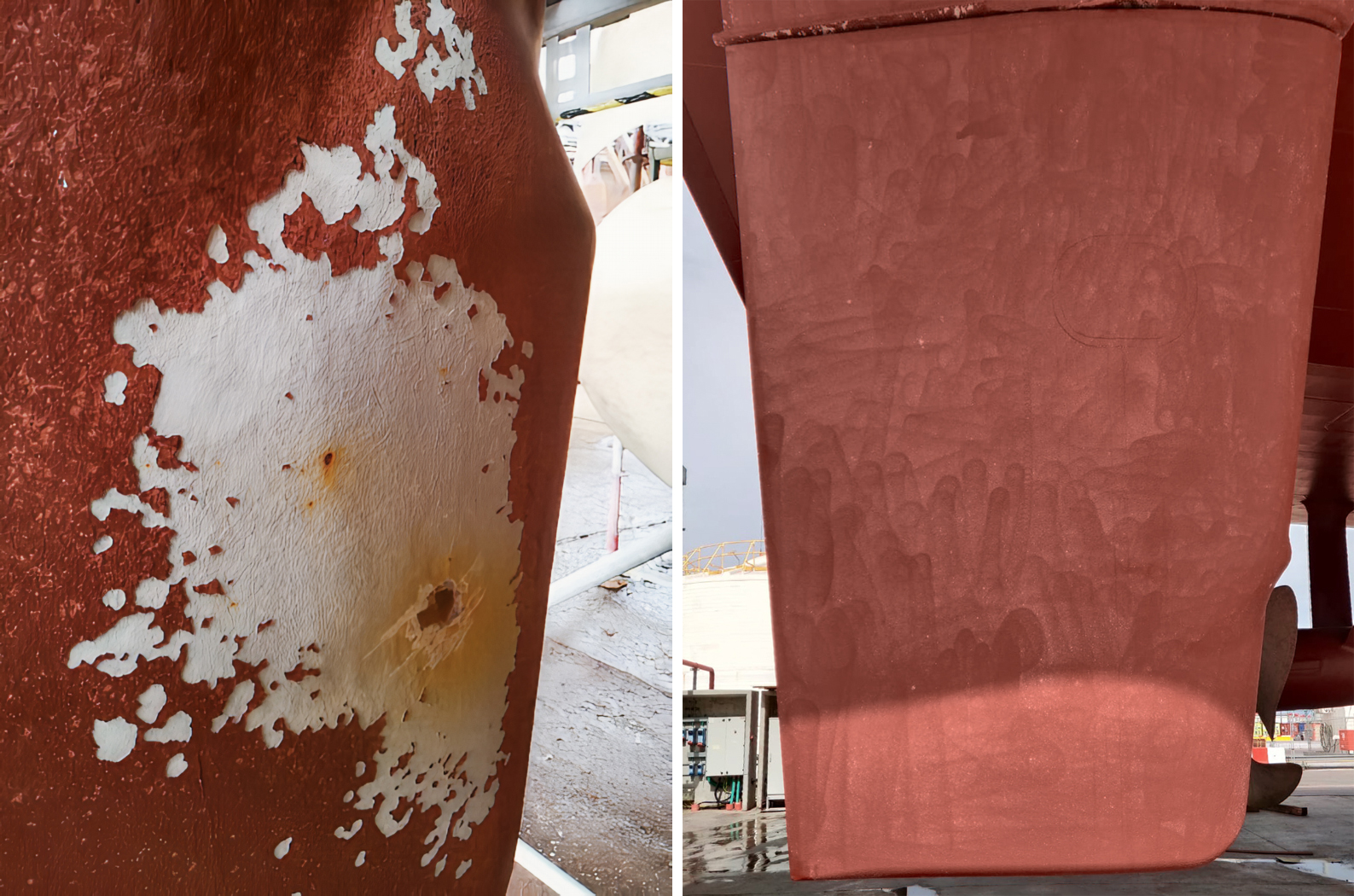 When a ship comes into drydock, maintenance of its rudder and running gear can be expensive and time-consuming. Cavitation and corrosion damage repair often involves hot work, resurfacing and grinding. Thus a poorly protected and damaged rudder or other running gear can extend drydocking time and costs considerably.